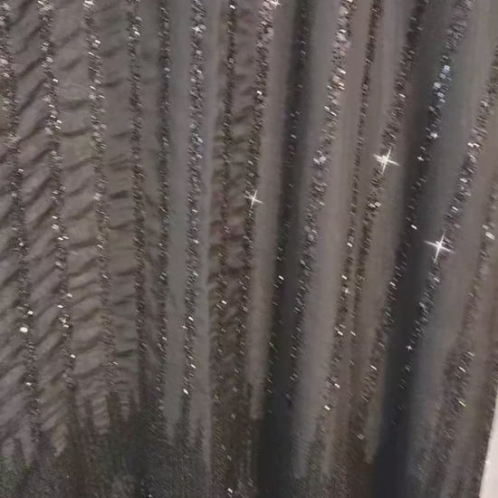 Drenched in the depth of tissue silk, this kaftan redefines evening elegance with a dramatic, linear design. The garment features vertical crystalline pathways that elongate the frame, leading to a lavishly embellished hem and cuff teeming with midnight cut dana embellishment.The fluid draped sleeves create a sense of effortless majesty. As the light hits the intricate embroidery, the black-on-black textures create a subtle yet hypnotic shimmer, making it the perfect choice for a gala, a high-profile dinner, or any moment where you wish to embody mysterious, dark-toned luxury