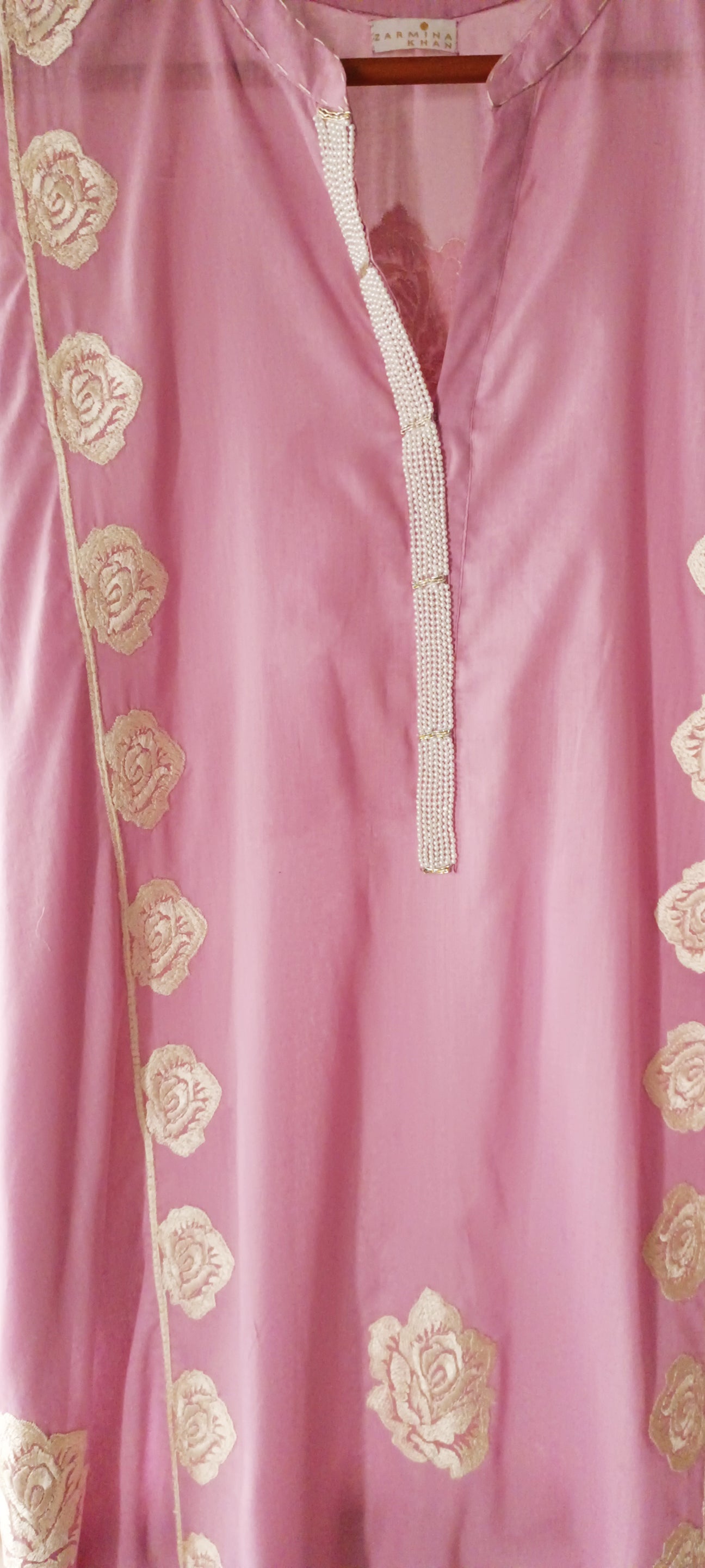 Pure Malmal Lawn Shirt with Off White Roses Embroidery (malaml slip), hand embellished pearl placket