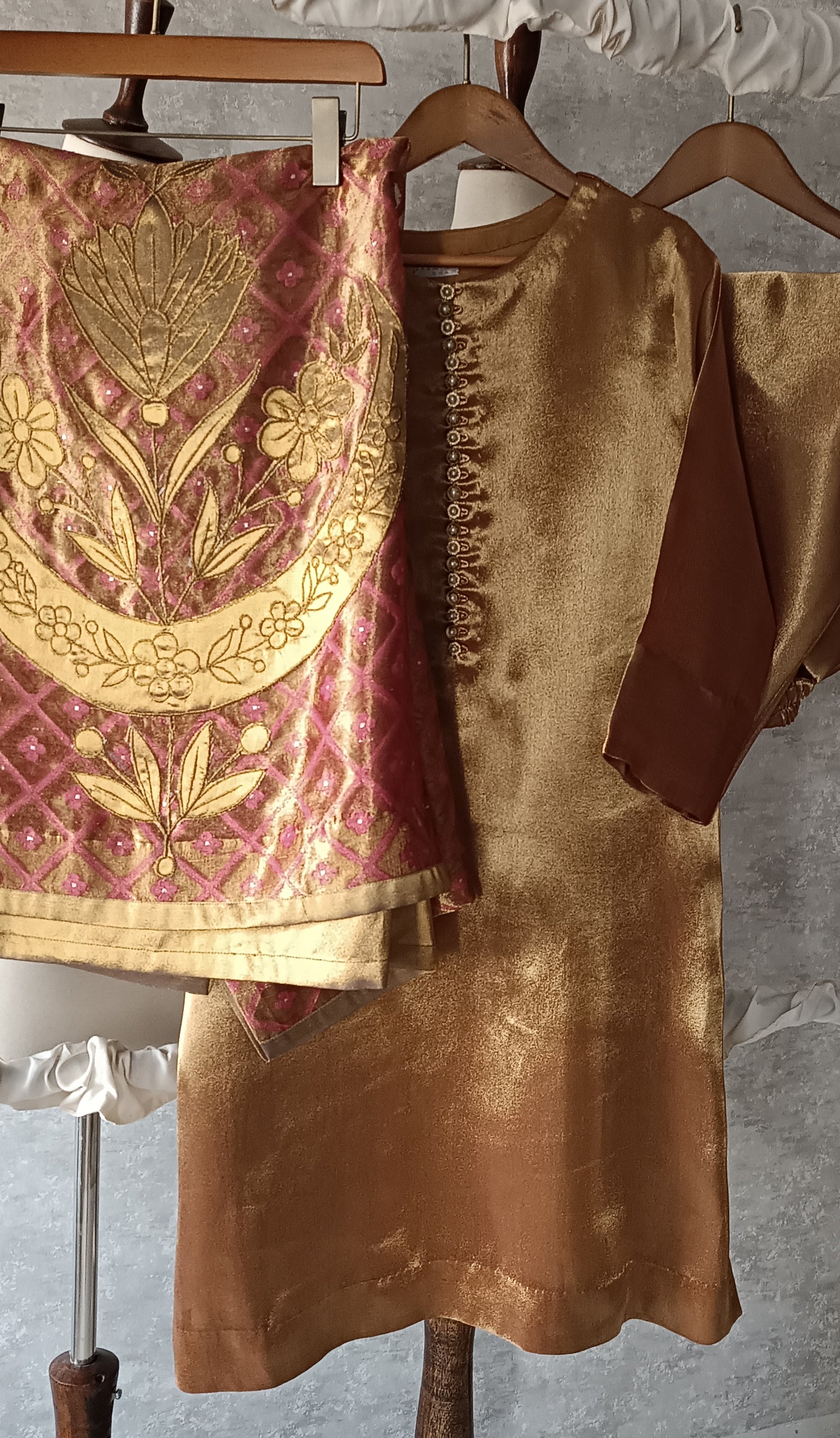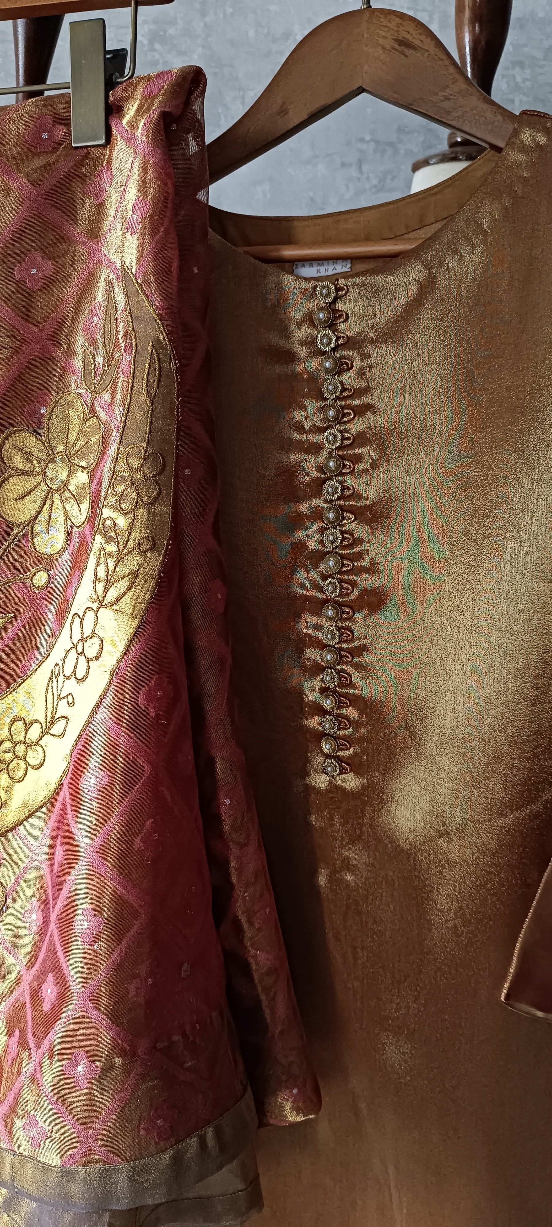 Pure Zari Tissue with Gold Applique work on pure jamawar tissue jacqard duppatta, shirt with slim fit rose gold shalwar (3pcs)