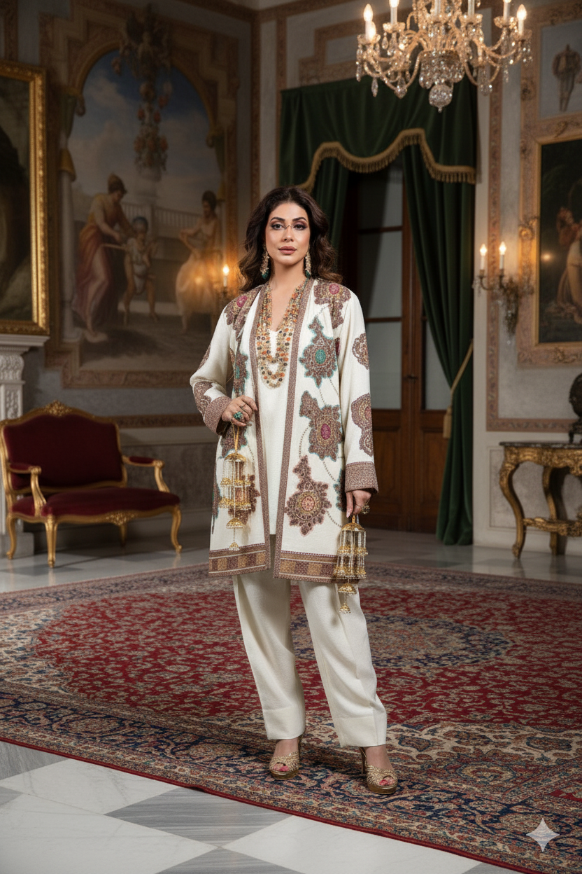 Pure wool ivory Jacket with Kimkhawab Applique and hand embellished work. Pure wool under shirt and slim fit shalwar .3 pcs outfit.