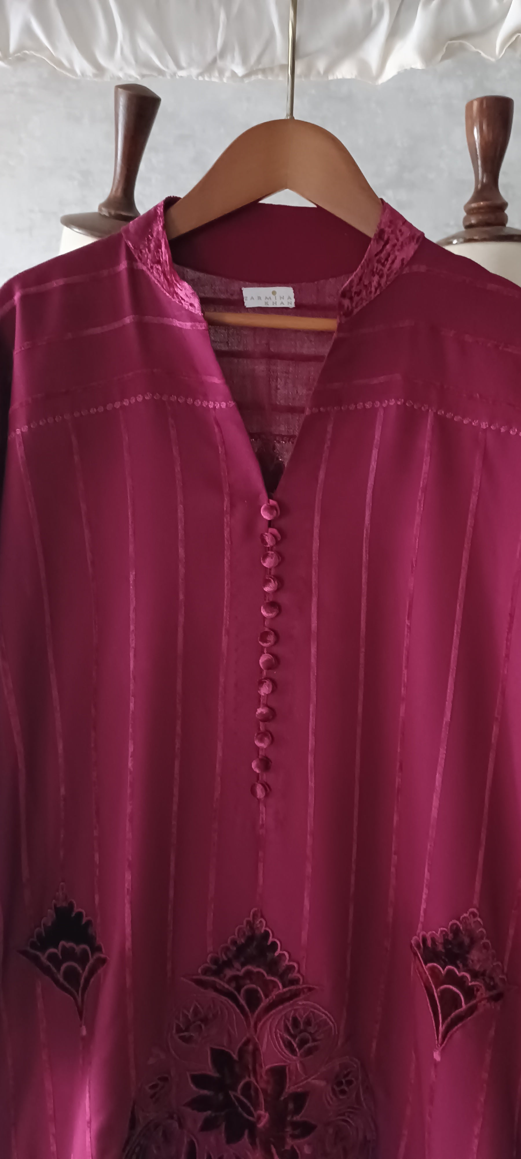 Winter Edit - Velvet Applique - Pure Velvet striped Linen- Deep Fuschia Pink